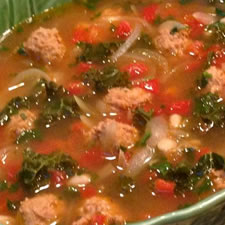 For the meatballs: Mix together panko, ground turkey, 1/4 cup Pecorino, parsley, egg, garlic and 1 teaspoon salt and mix. Season with pepper. Gently form into 3/4 inch meatballs. Heat the olive oil in a large pot over medium heat. Add the meatballs and brown turning occasionally. Transfer to a platter. For the soup: Add 1 tablespoons of broth to a pot. Add the onion, celery and carrot and cook, stirring occasionally, until soft and translucent, about 10 minutes. Add the garlic, thyme and red pepper and cook 3 minutes. Stir in the escarole and cook until just wilted, about 2 minutes. Add the chicken broth and tomatoes; bring to a gentle simmer. Return the meatballs to pot, cover and cook for 10 minutes, stirring occasionally. Season with salt and pepper. Per Serving (does not include added salt): 207 Calories; 5g Fat (22.4% calories from fat); 1g Saturated Fat; 26g Protein; 16g Carbohydrate; 3g Dietary Fiber; 4mg Cholesterol; 1408mg Sodium. Exchanges: 1/2 Grain(Starch); 3 Lean Meat; 1 1/2 Vegetable; 1 Fat. COOK'S NOTE: Spinach or Kale can also be substituted for the Escarole. Low Fat Recipes Furnished by LowFatLifestyle.com© - Copyright 2014 |