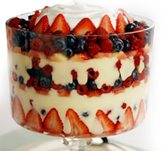 Prepare pudding. Add 4 cups of cold milk to 1 large package pudding mix. Beat for 2 minutes, and set aside. In a large clear bowl, assemble your trifle. Place 2 cups cubed angelfood cake, followed by 1/2 of strawberries and 1/2 of blueberries. Now spread 1/2 of prepared pudding over the top. Repeat the four layers. Spoon 4 oz. whipped topping on top, and place your reserved strawberries and blueberries as garnish. Cover with plastic wrap and refrigerate 8 hours or overnight before serving. *COOKS NOTE: Can also use 3 cups strawberries and 2 cups raspberries and 3 cups blueberries if desired. Per Serving: 125 Calories; 1g Fat (10.2% calories from fat); 4g Protein; 25g Carbohydrate; 2g Dietary Fiber; 1mg Cholesterol; 205mg Sodium. Exchanges: 1/2 Fruit; 1/2 Non-Fat Milk; 0 Fat; 1 Other Carbohydrates. Low Fat Recipes Furnished by LowFatLifestyle.com© - Copyright 2007 |